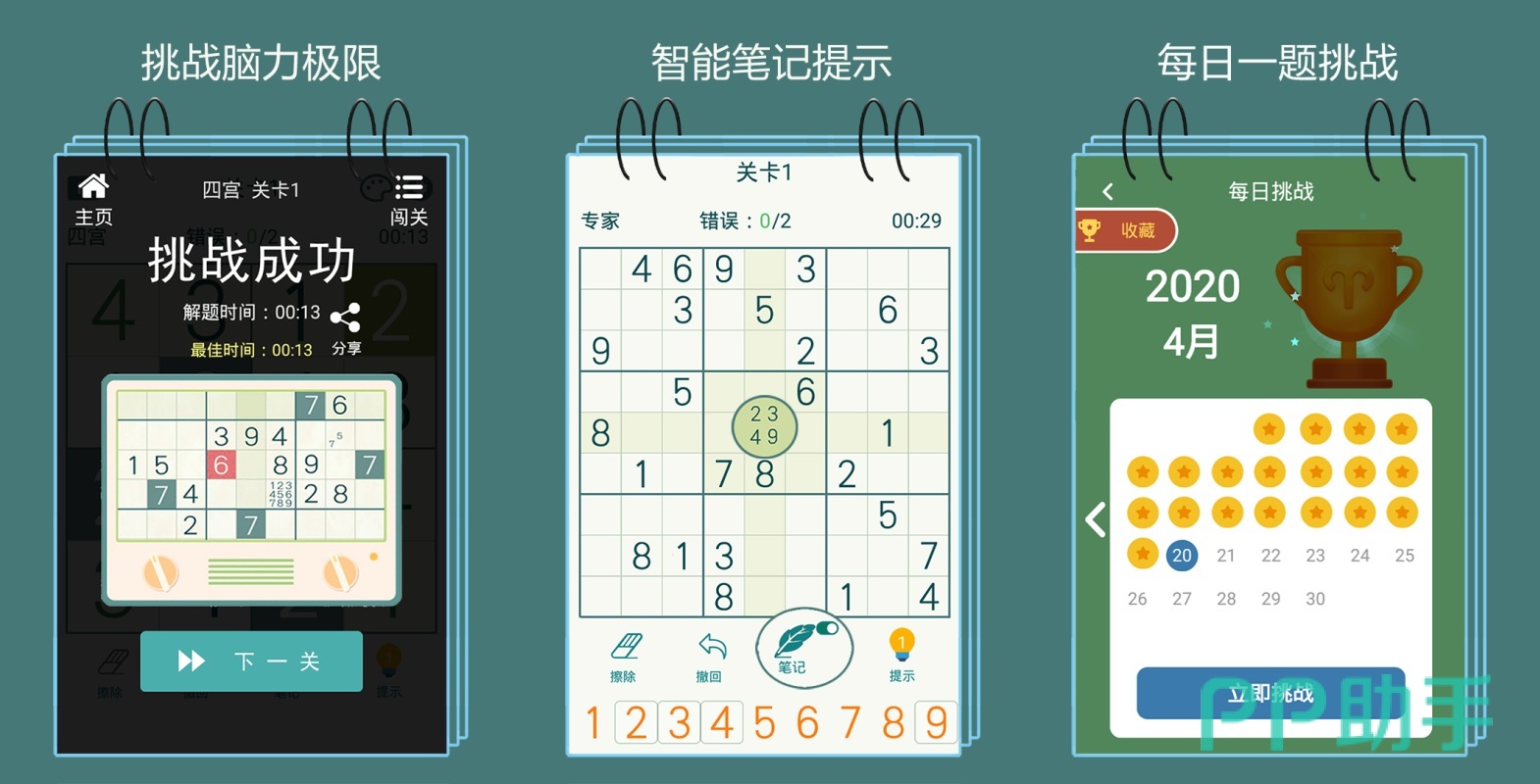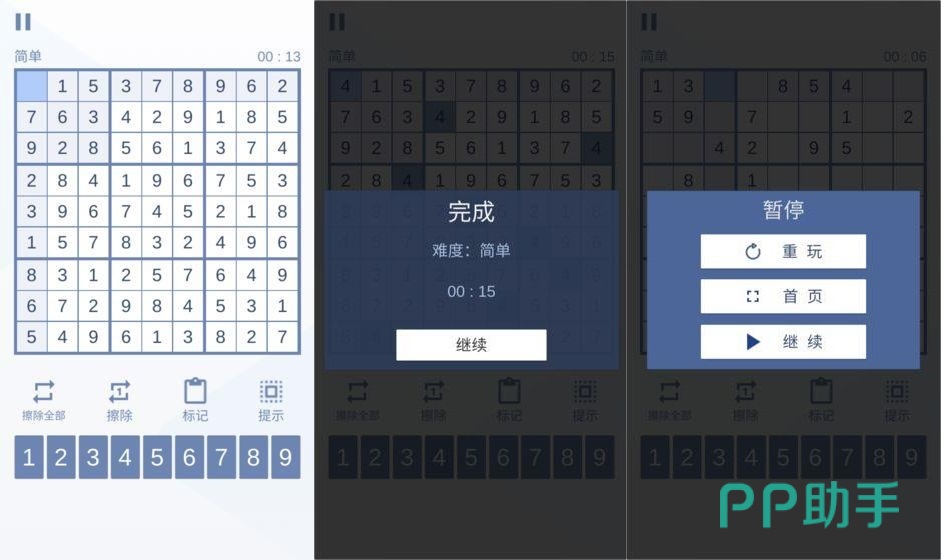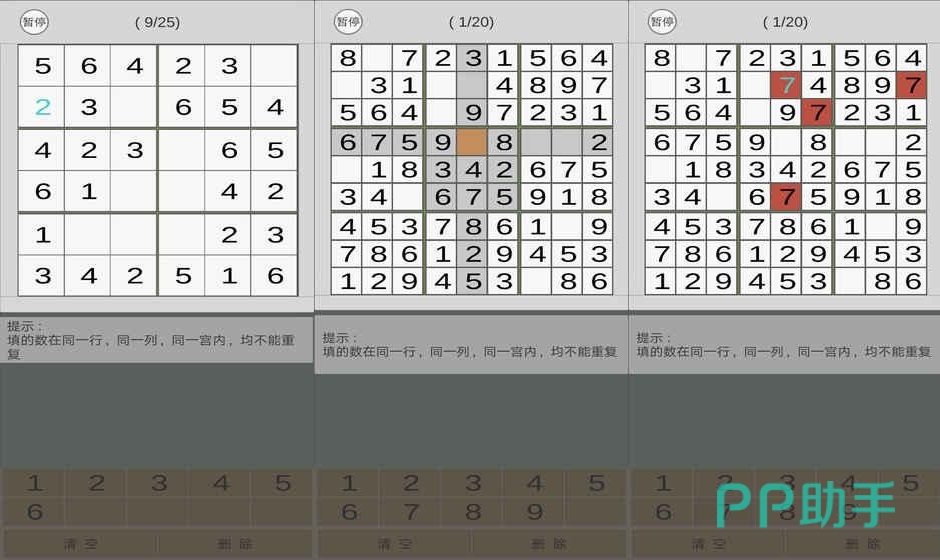 将数字1~9填入方格中,横竖都不能有重复的数字,也不能遗漏掉任何一个数字。很考验逻辑和思维能力的游戏。为此设计者设计了不同游戏难度可供玩家选择,玩家根据自己需求挑战自己的能力极限。