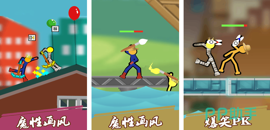 《乱斗火柴人》是一款横屏沙雕格斗游戏,游戏有单人模式、双人模式、生存模式三种可选。单人模式中玩家可以在格斗开始前选择战斗场地、火柴人颜色、武器和装饰,还能选择左右手模式。游戏开始后玩家需要操控小小火柴人对对手进行进攻,谁的血条没了谁就输了,游戏三局两胜制。双人模式和生存模式都可以两人在一台手机上操作玩耍。