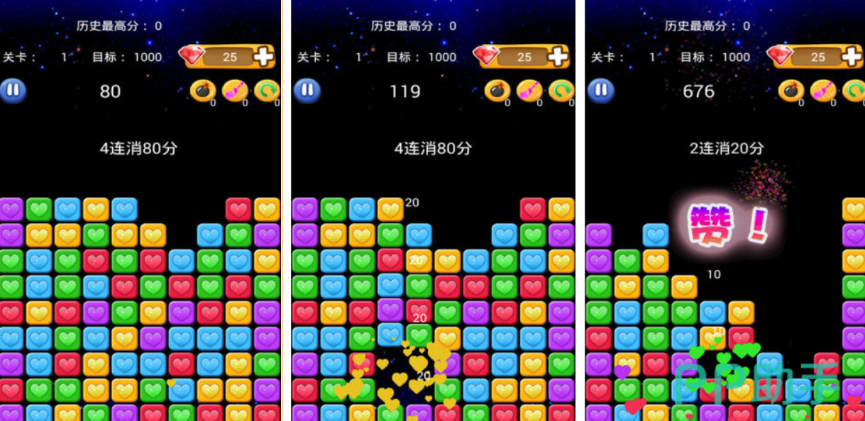 消灭星星甜心版中,把星星的logo变成了可爱的爱心形状,玩家消除起来也很过瘾,消灭星星甜心版已经成为手机游戏排行榜中位列前茅的消除游戏了。这款游戏里的玩法考验每一位玩家的智慧,玩家还需要有耐心才可以找出破绽通关,游戏新增了很多有意思的道具,用这些道具可以获得更高分数。