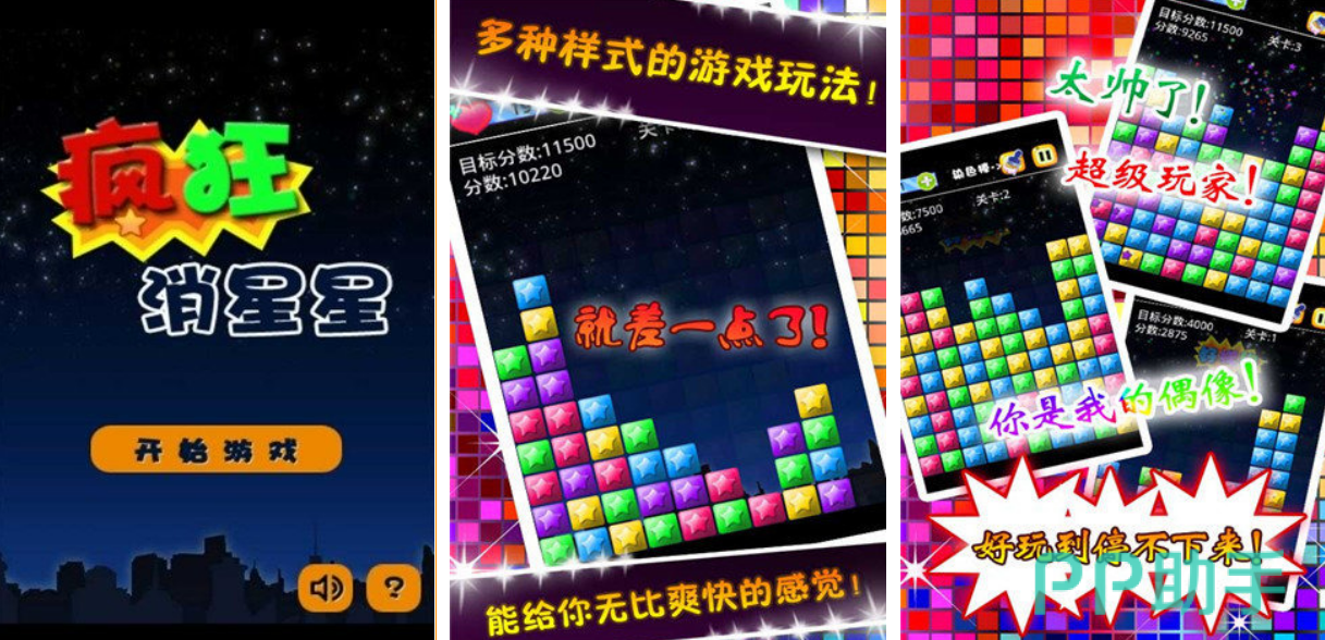 疯狂消星星2就跟游戏名字一样,疯狂就完了,疯狂消星星2沿袭了传统的消灭星星的游戏玩法,还是以解压为主,手指点击屏幕然后消除星星的感觉真是太解压了,玩法跟以前的消灭星星有点像,但是不完全一样,要想得高分就要用道具和聪明的大脑,游戏中消灭的星星越多,那么玩家获得的分数也会越高的,所以聪明的玩家会利用游戏中抽取的道具来帮助通关。