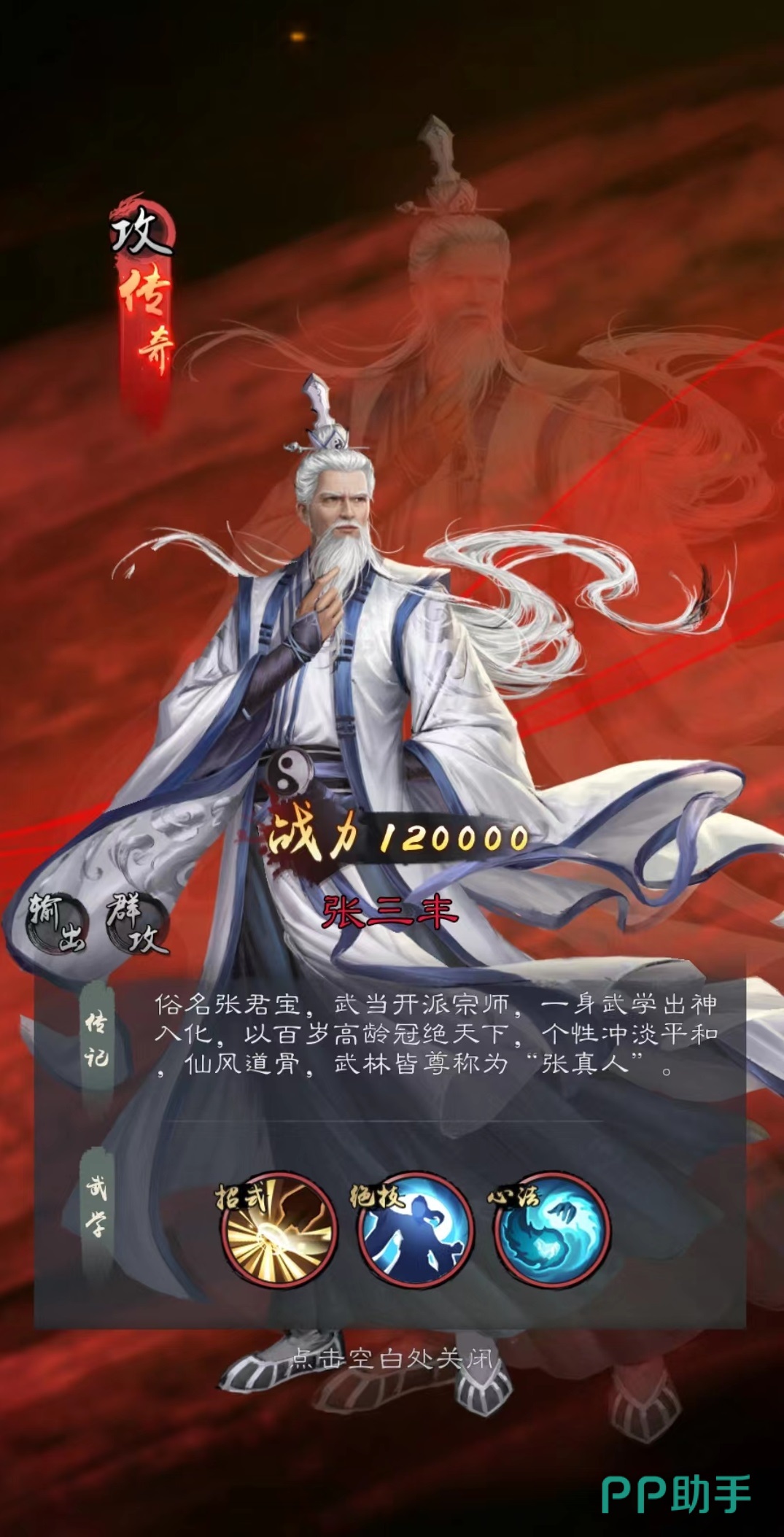 张三丰作为武当开山老祖非常擅长后期收割,在心法纯阳无极功的加成下,每一回合都可以叠加一次爆伤加成buff,最多能叠加到50%。绝技太极无量效果是对方存活人数越少,则总体伤害越高。后期往往出现张三丰一人将对方全部收割的情况。