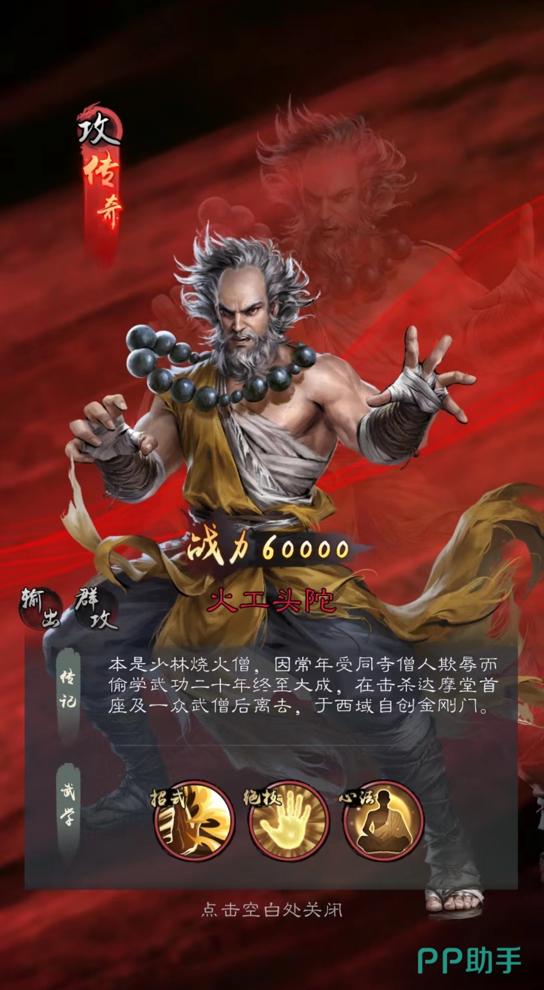 火工头陀,擅长群体攻击,绝技金刚波若直接对敌方前排造成输出,如果伤害目标当前被控制则额外提高暴击伤害。心法洗髓经使得火攻头陀可以免疫所有控制效果,同时在受到控制时有几率将其反弹回去。这些特性使得火攻头陀非常擅长克制对方的控制阵容,如果运气好还能实现反制。