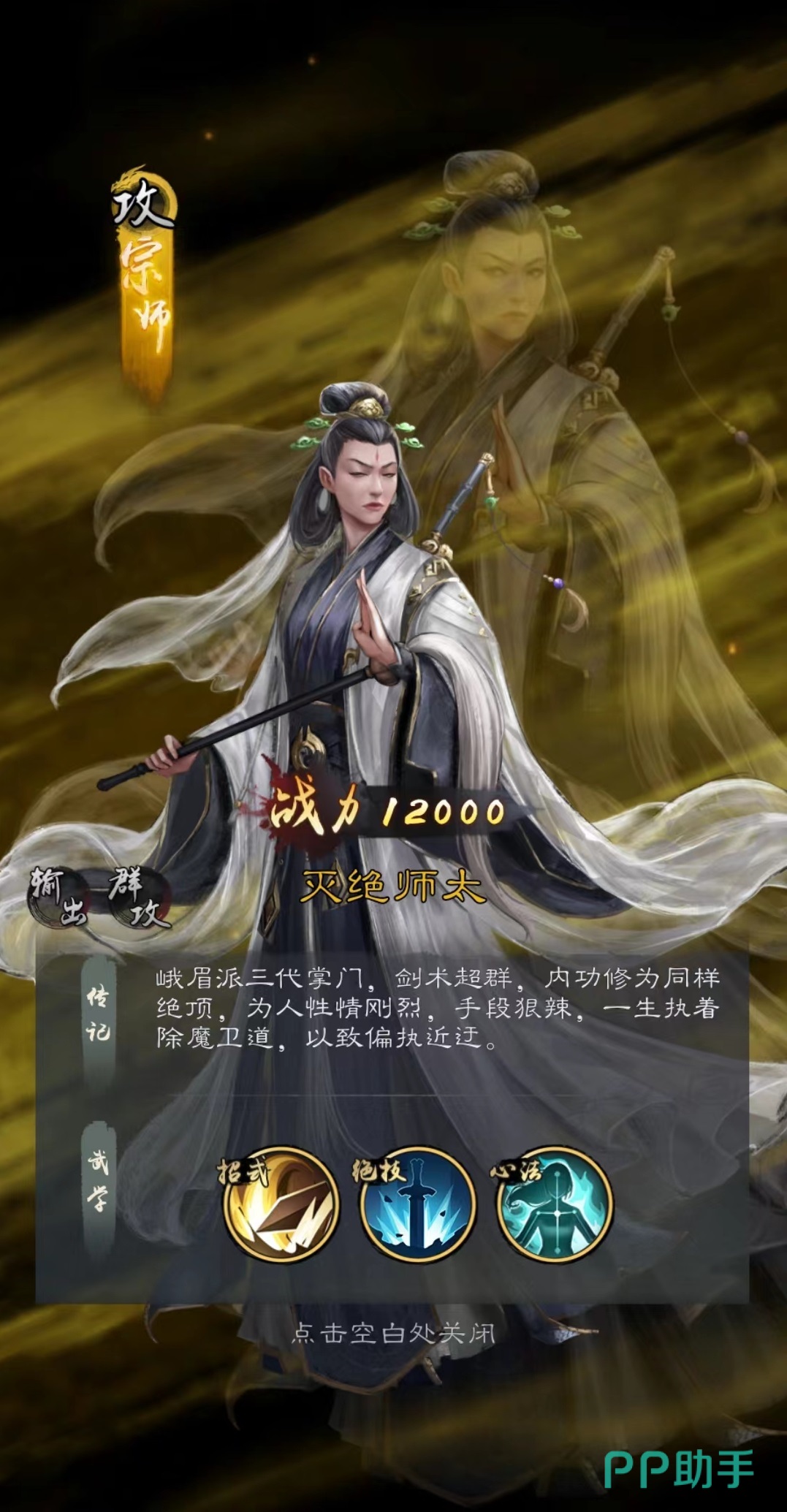 灭绝师太非常擅长对付敌方的控制侠客,技能灭绝双剑在造成全体伤害时对控制性目标会有额外加成。心法峨眉九阳功,在战斗开始后进行计算,每隔一回合自身攻击力会增长一次,最高能叠加到40%。也就是说将在第4回合灭绝师太的输出达到顶峰,届时将拥有不低于传奇品质角色的伤害能力。