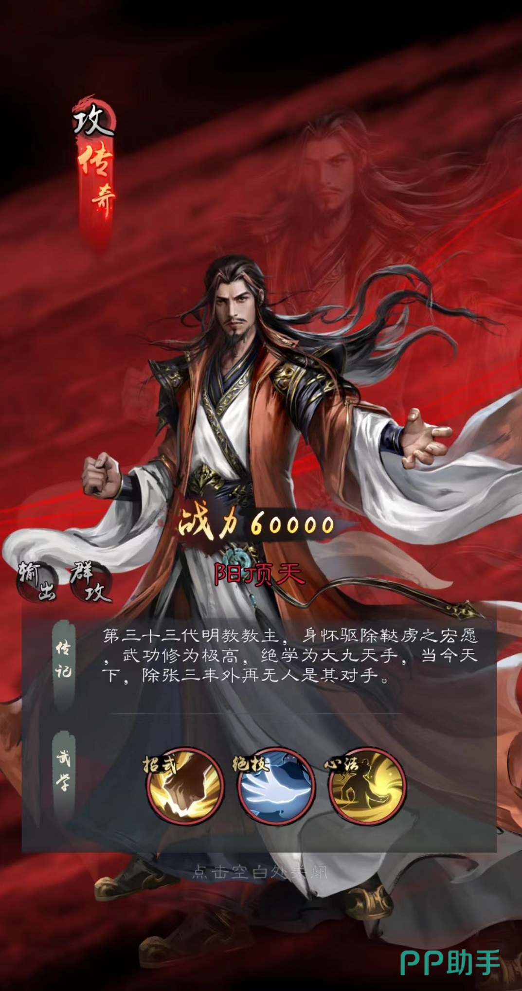 阳顶天是明教教主,自身绝技大九天手伤害对方全体,并且有几率将伤害目标的怒气转移到自己身上。20%的几率能够保证每次放技能自身都能恢复至少两点怒气,这对于整体续航来说是非常关键的。所以阳顶天运气好的时候可以频繁释放大招造成高额输出,再加上大挪移心法加成,在奇数回合的战斗中自身伤害大幅提高。