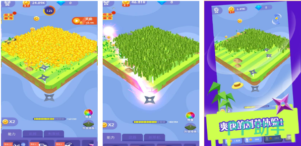 《割草的100种方式》能够让玩家在超大的草地里进行收割,除剪刀开始一步步的强化自己的装备到最后的大型除草机,把草地全部收割成光秃秃的一篇,整个过程相当的解压。