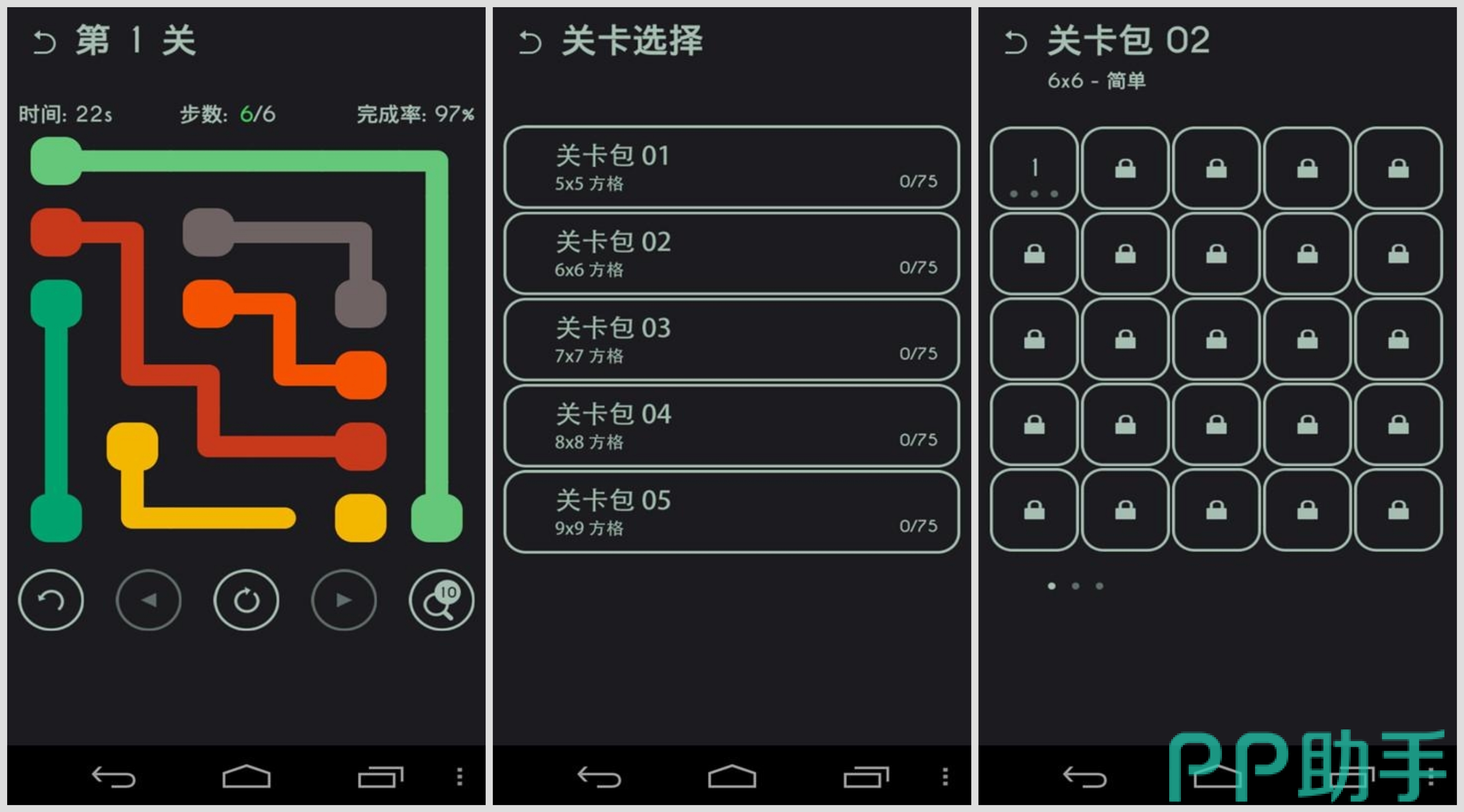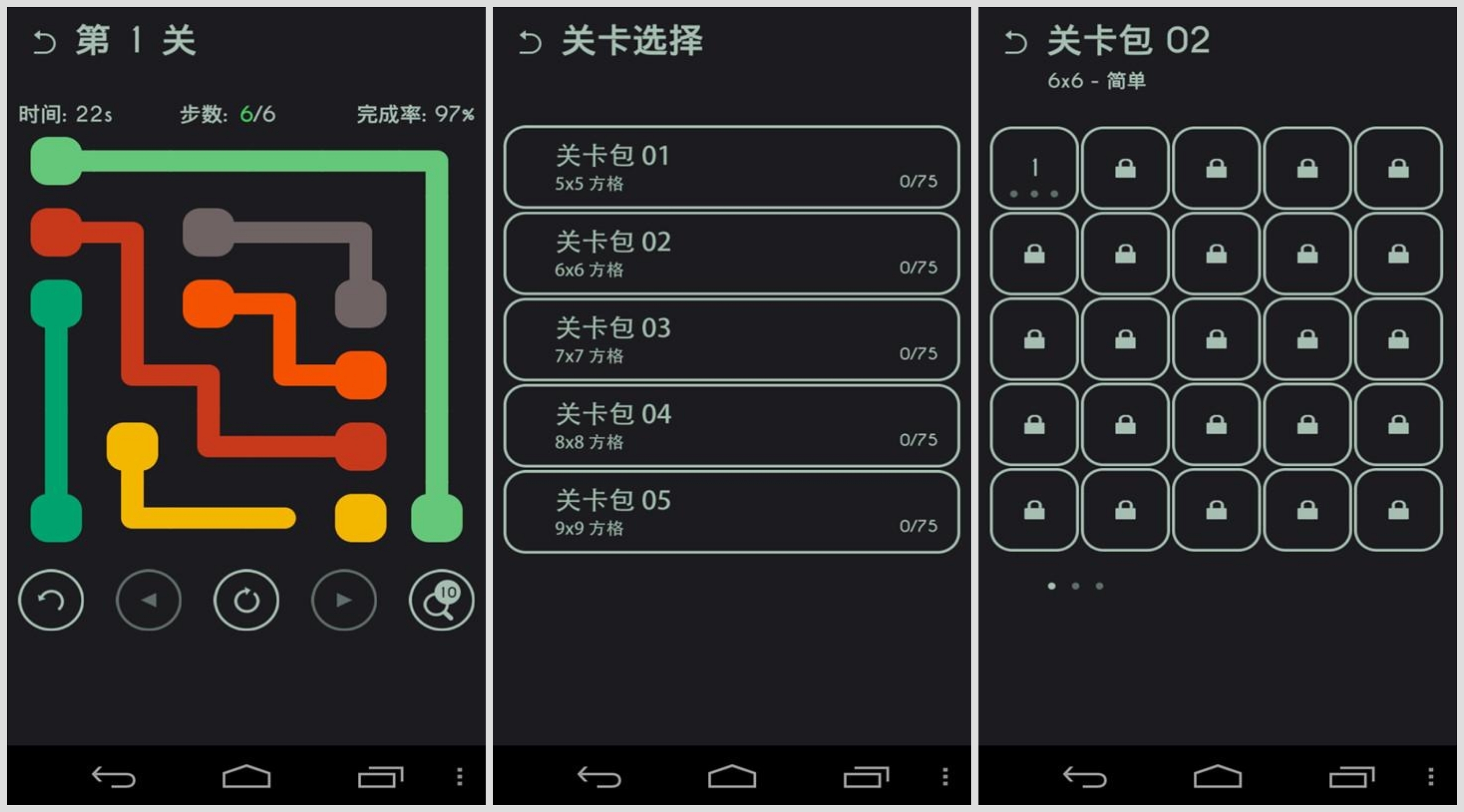 《连线达人》是一款非常锻炼玩家脑力的休闲益智游戏,打开游戏,系统便会告诉你游戏规则,每一关会出现很多颜色各异的小圆点,玩家的任务就是将同样颜色的点连在一起,但并不是之辨认颜色就能通关的,你必须注意相同颜色小点的位置,如果离得比较远,连起来后很可能会与其他颜色点的连线交叉,出现交叉的线条就你就得重新开始了。当矩形的圆点都被不交叉的线条连接起来时,你就能获取进入下一关的资格了。