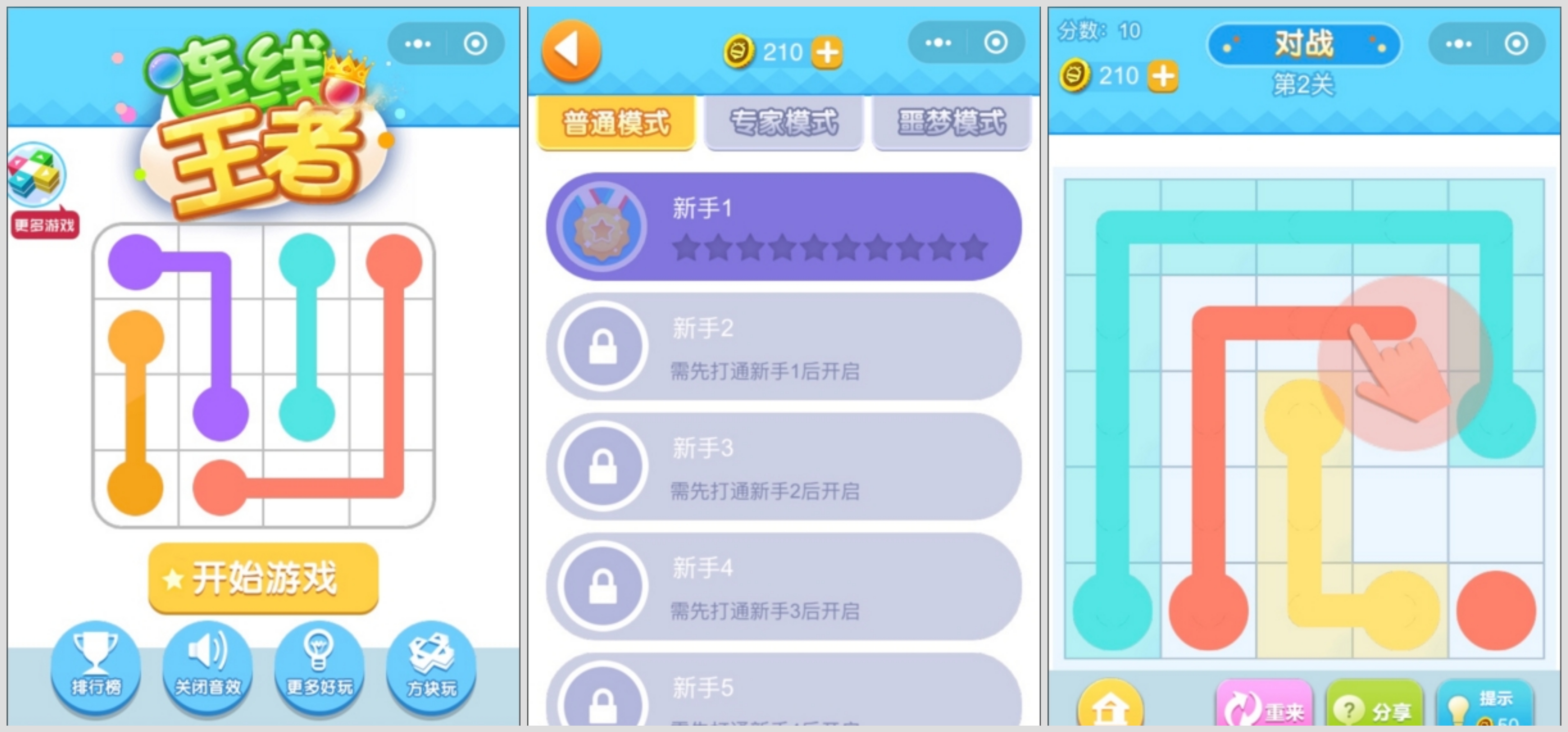 《连线王者》是一款非常容易上瘾的魔性小游戏,普通、专家、噩梦三种模式供你选择。游戏关卡循序渐进,玩家需要通过前一种模式的所有关卡才能解锁下一种模式。地图则采用五颜六色的几何图案,单指滑动屏幕,地图上便会留下痕迹。游戏不会提供通关提示,一切路线都需要玩家自己决定,走错一步,你就得从新开始哦。
