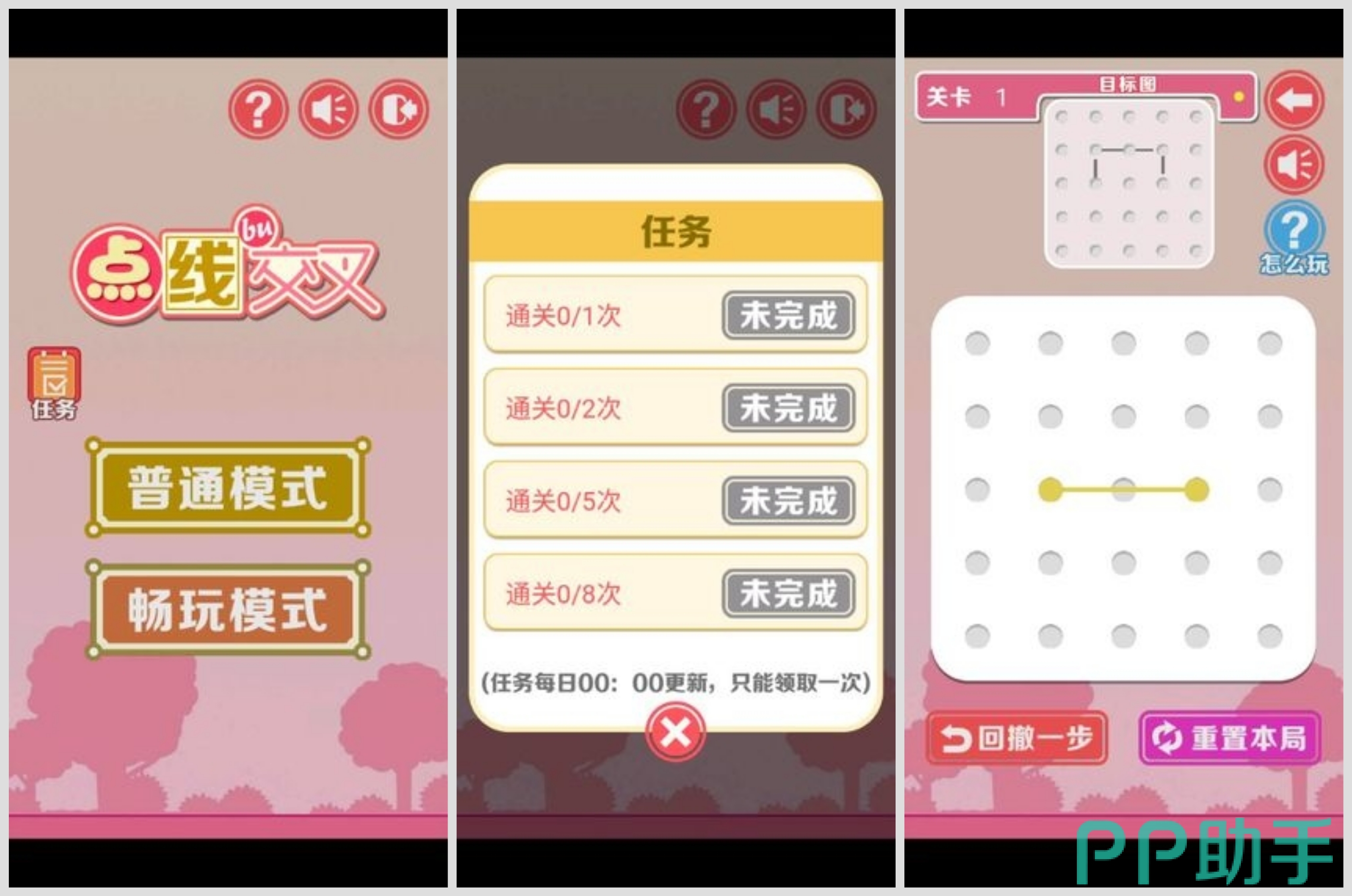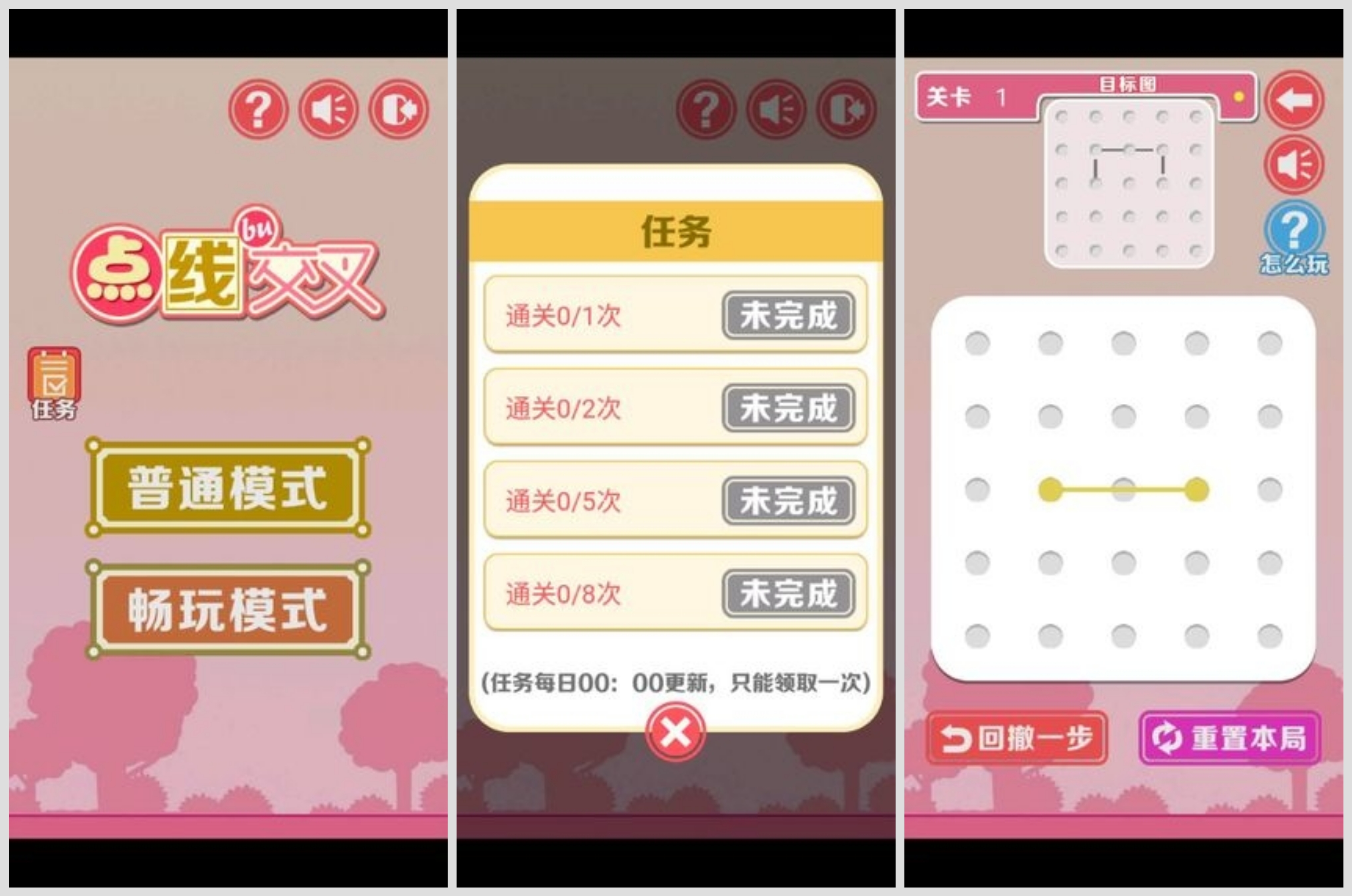 《点线不交叉》是一款简单的两点连成线的通关游戏。游戏分为普通模式和畅玩模式,玩家需要从一个点拉出一条直线,到另一个点结束,在没有出现交叉线的情况下将线条编织成任务所给图案就可以通关了。