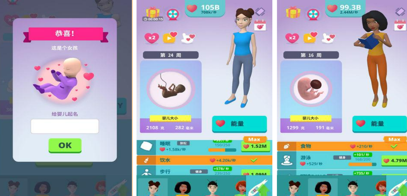 想不想体验一下做母亲的感觉呢?想感受自己从怀孕到生娃,到陪孩子成长的快乐就来玩这款《生娃模拟器》,游戏中就像真实的在做一个母亲一样,等待十个月让孩子降临,然后玩家要陪着宝宝长大,在游戏里可以给宝宝穿上可爱的小衣服,还要收拾宝宝的便便,给宝宝喂奶,简直就像真的在手机里养了一个宝宝一样,能给那些没有孩子的女性玩家提供经验。