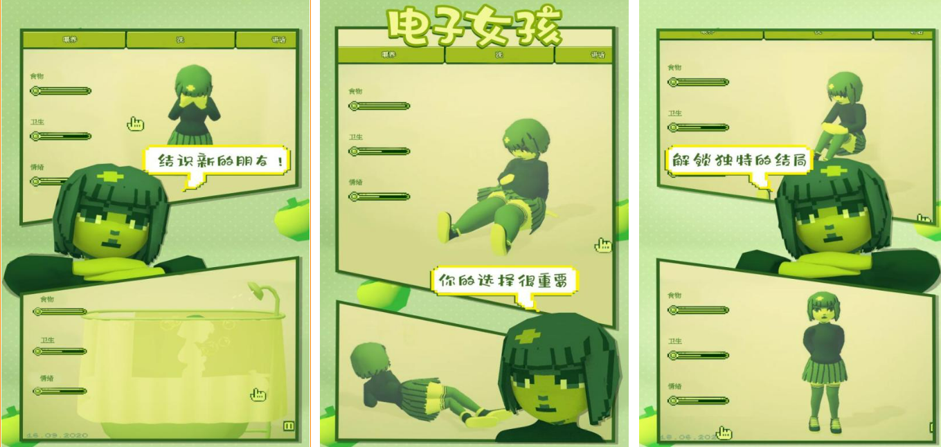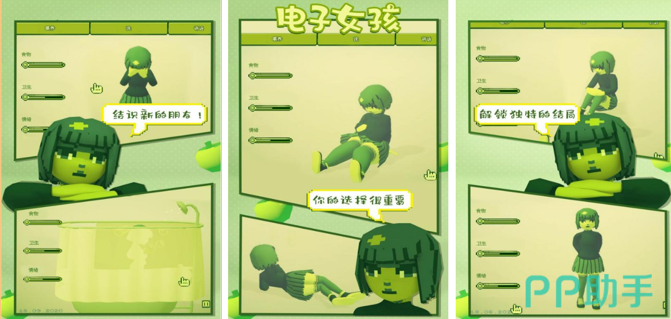 《电子女孩》的游戏里玩家要做一个电子孩子的家长,这是一款比较新颖的养成游戏,游戏中玩家必须全心全意的陪伴这个小孩子,因为玩家做的任何一件不好的举动都有可能导致故事的情节向坏的方向发展。这款游戏的画风还是比较诡异的,有玩家喜欢,也有玩家不喜欢这样的游戏。