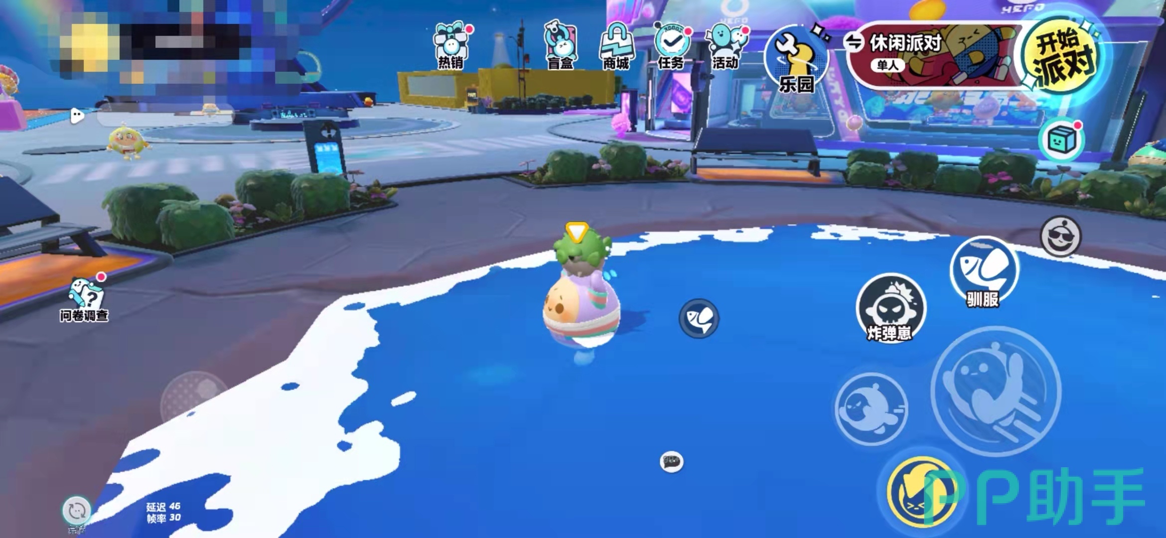 广场中间的水域,当你操作蛋仔走进水中,会出现一个摸鱼按钮,捉到河豚后驯服,可以作为投掷道具和他人互动。除了以上这些彩蛋以外,广场中还会刷新许多道具“彩蛋“,使用炸弹、咸鱼等趣味道具,和其他小蛋仔在广场上自由嗨森吧!