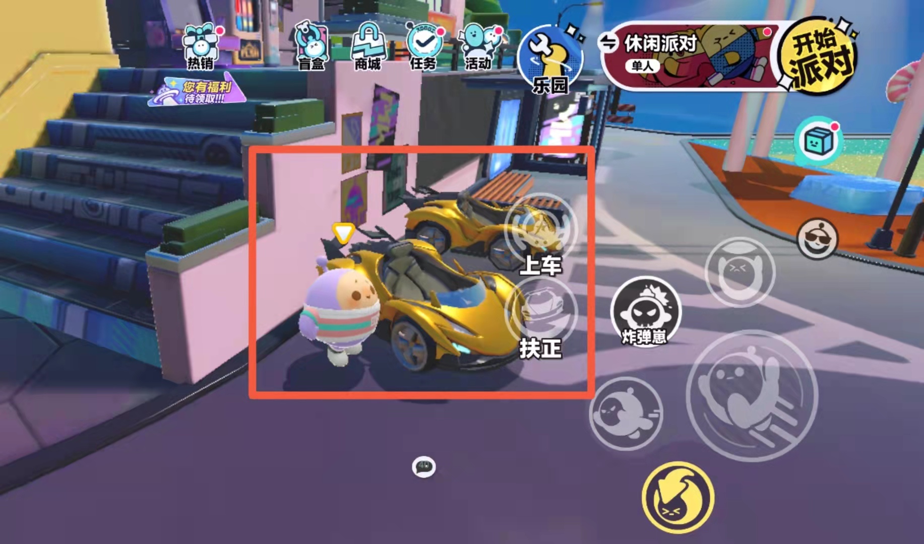 在盲盒商店侧边楼梯下停着的黄色敞篷小车也是可以开的哦,当你凑近上车按钮就自动出现了,开着有点小炫酷的跑车兜兜风吧!从楼梯上去,你会看到停着一架粉色喷气飞机,虽然不能驾驶,但你可以跳上去,让它带着你盘旋一圈呀~