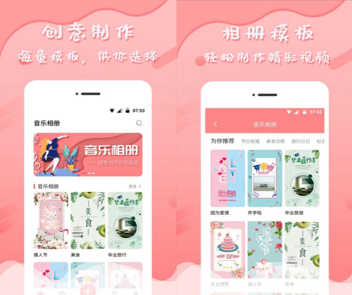 音乐相册是一款拥有多种BGM的相册制作软件,点进软件主页以粉色少女心为主颜色,深受广大女孩子的喜爱。丰富的主题风格,可以让小伙伴们更好的记录和回味生活中的温馨瞬间,本款软件还可以一键生成精致的贺卡邀请函。