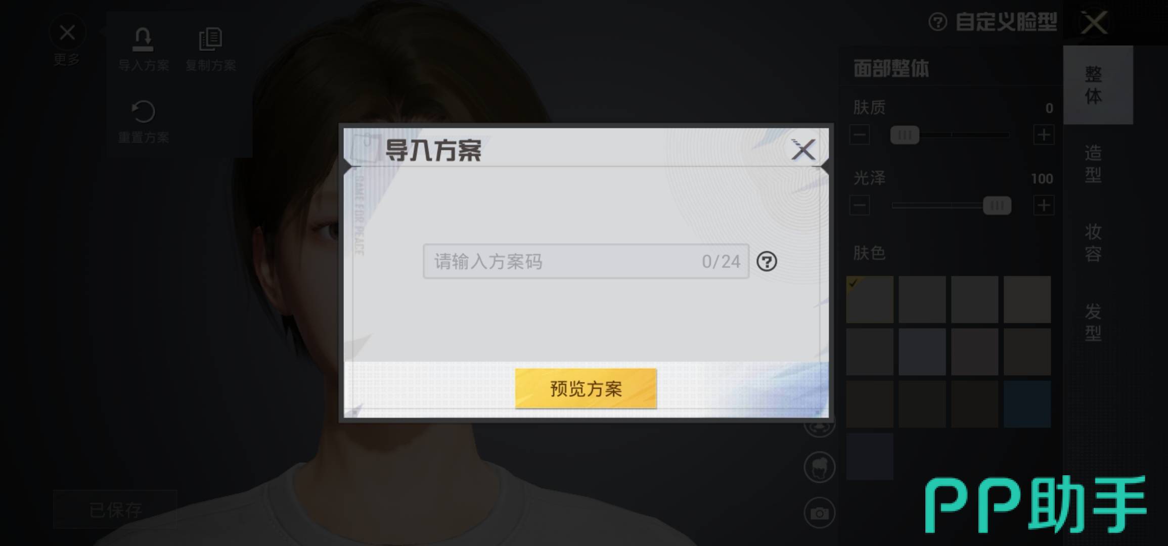 点击导入方案之后系统将弹出导入方案对话框,玩家只需要在对话框里将捏脸码输入进入,然后点击预览方案,此时你的形象就会发生改变,在这个时候直接点击保存之后,整个过程就结束了。