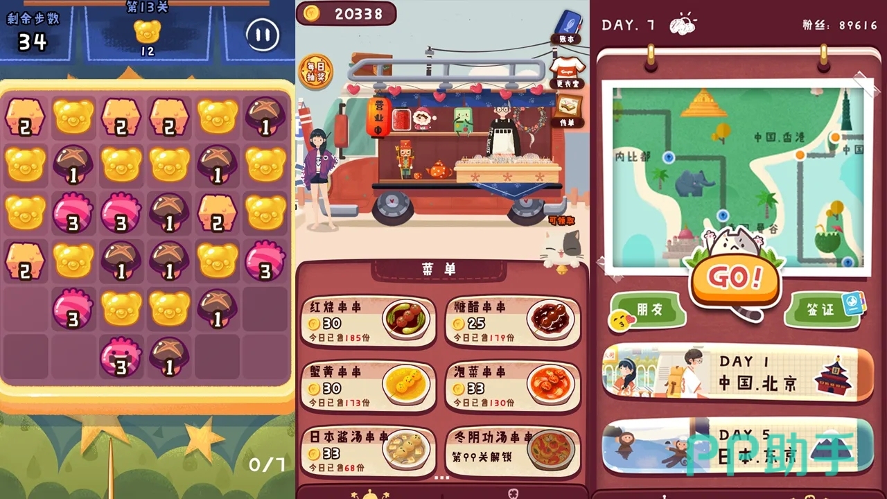 三消是为了获得食材。下一步就是旅行开店玩法,旅行展开游戏的主线剧情,邂逅各种人物,进行对话,了解新奇的剧情,进入世界上像日本、美国等地区使用餐车开店。丰富食材可以制作成不同串串美食,满足店内顾客的口味。