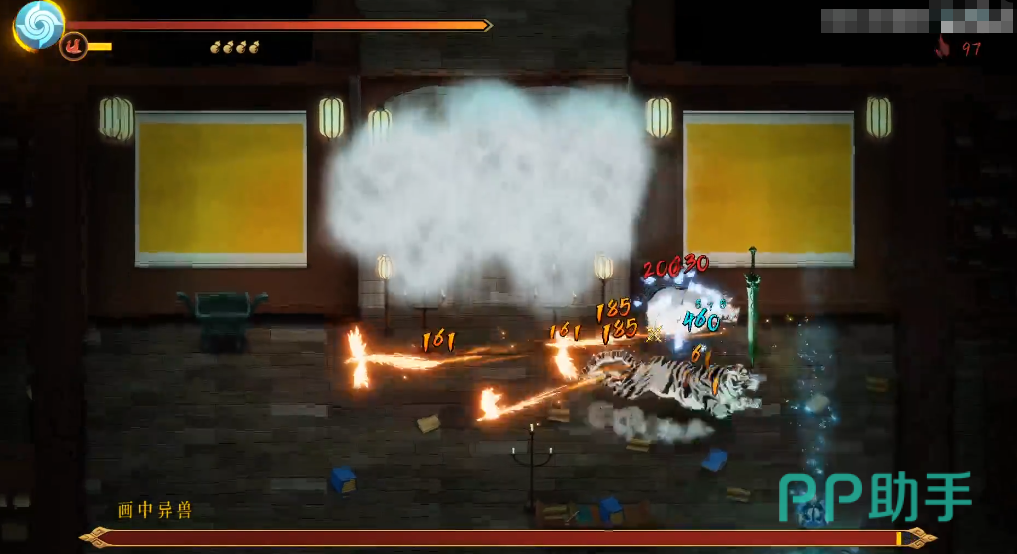鹤之章的小boss画中异兽具有四形态,对应四大家族,每次一般只出现两种,猪和龟和虎方式类似,会在地上来回冲撞的轨迹上留下碰到会掉血的白火,鹤则是用旋风和空对地冲击,稍微难打一些,对闪避的要求会高。
