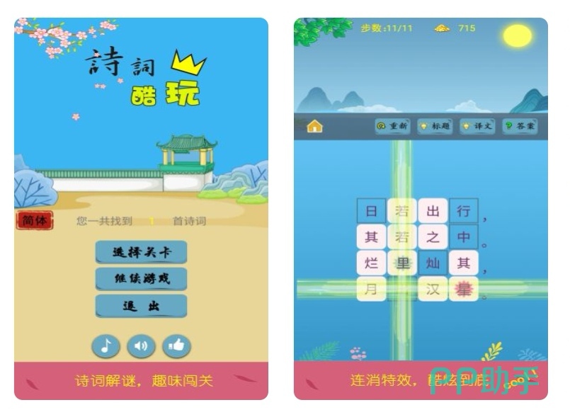 题目的设计和构思都非常的巧妙,整体操作简单容易,涉及400多名篇佳作,为的就是激发大家对诗词兴趣,在遇到难题的情况下可以根据提示去完成。