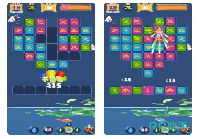 把汉字和偏旁部首与周围的汉字组合成新字就可以进行消除了,其中会出现一些你所想不到的汉字,为的就是让你体验中华文化的博大精深,在每一个关卡中消除固定数量的汉字就算成功。