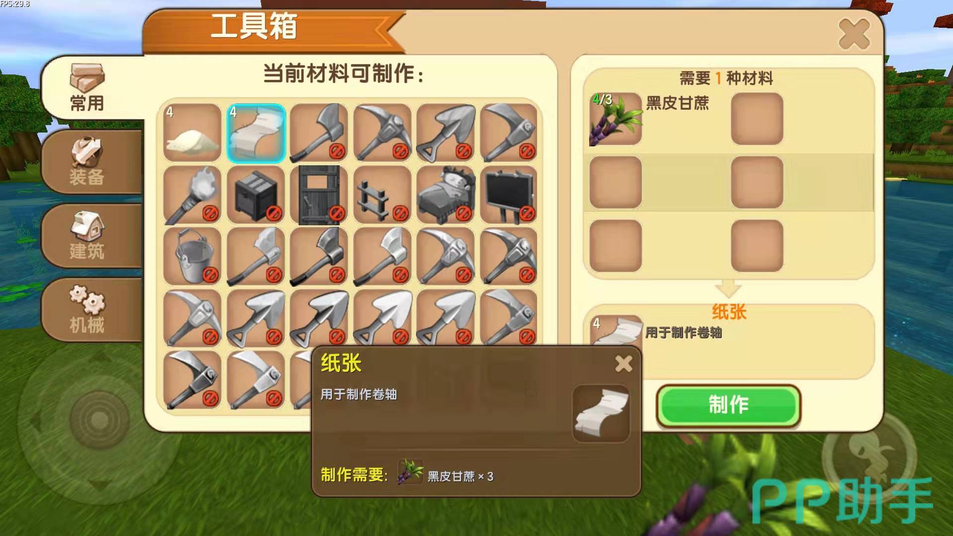 迷你世界的纸由黑皮甘蔗制作而出,制作消耗的材料比为4张白纸=3根黑皮甘蔗。