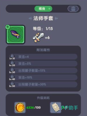当然,强大的攻击力效果是越多越好,使得玩家更快的通关。这个时候我们就可以增加一个魔术手套。如果想增加更多的增益效果,玩家可以对装备进行升级,这样增益效果会变的更高。魔术手套达到满级时能够给为玩家正价百分之十五的攻击和4点攻击力。
