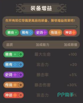 首先,在游戏内不同的装备能够增加增益效果,比如武器能够给玩家增加大量的攻击力和暴击率,让英雄在战斗中对敌方照成更多的伤害。