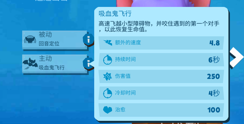 再来说堪称其灵魂技能的主动,注意看,此技能兼具了移速,伤害和回复三种作用!前文提到其迟缓的速度貌似与蝙蝠外形格格不入,而有了这个主动后,速度的劣势将再也不复存在,仅仅四秒的冷却,却可以提供长达六秒的加速,虽然飞行途中是不计算cd的,但每四秒一个移速,可以说跑图这方面已经强过游戏中百分之九十以上的角色了。