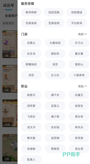 2、筛选种类多。梦幻西游专区中可对某个神兽、职业以及门派进行筛选,共十二个门派和十九个职业的账号都有,也能对人物账号评分设定一个范围,通过这些详细的数据来定位账号,如果自己的预算有限,也可以将排序调整成为价格从低到高,这样就会优先展示便宜的账号。