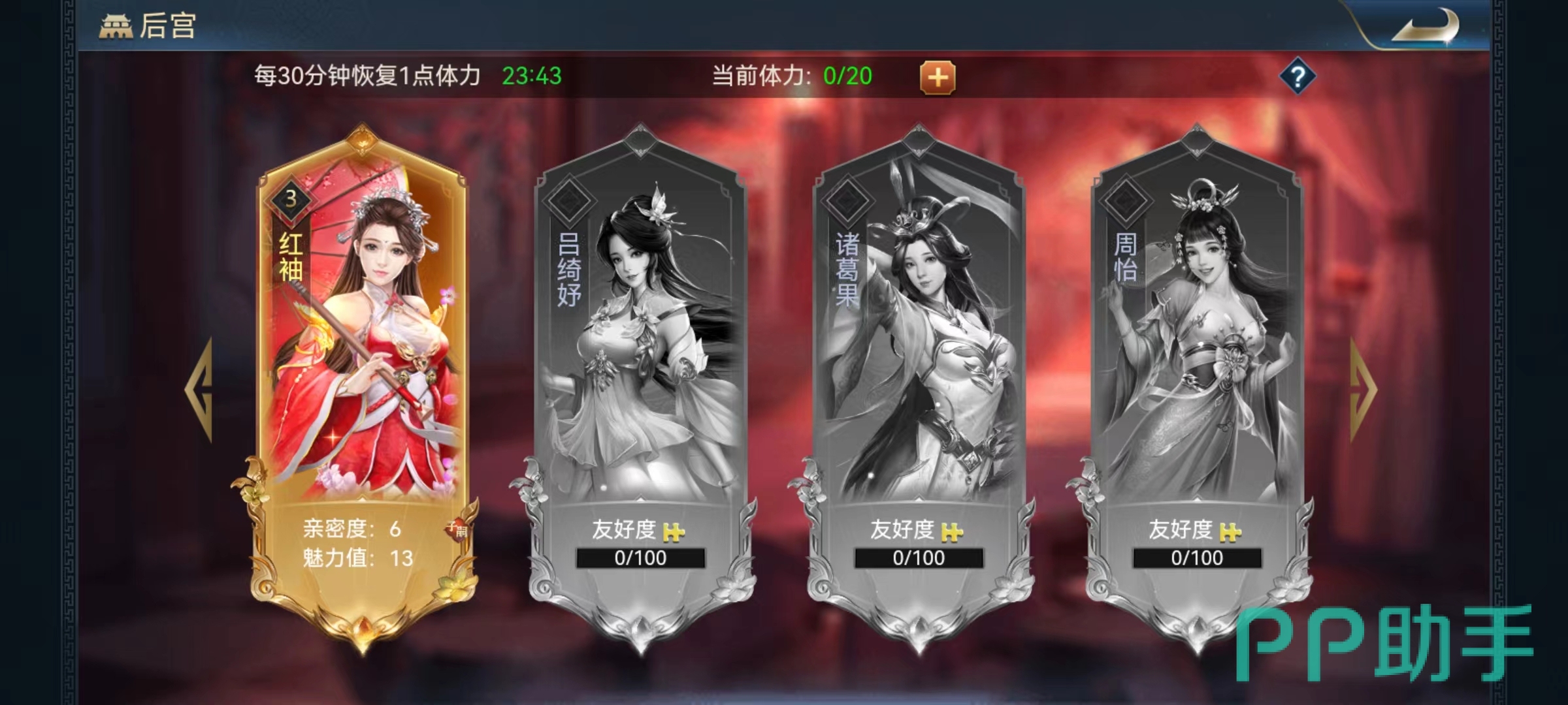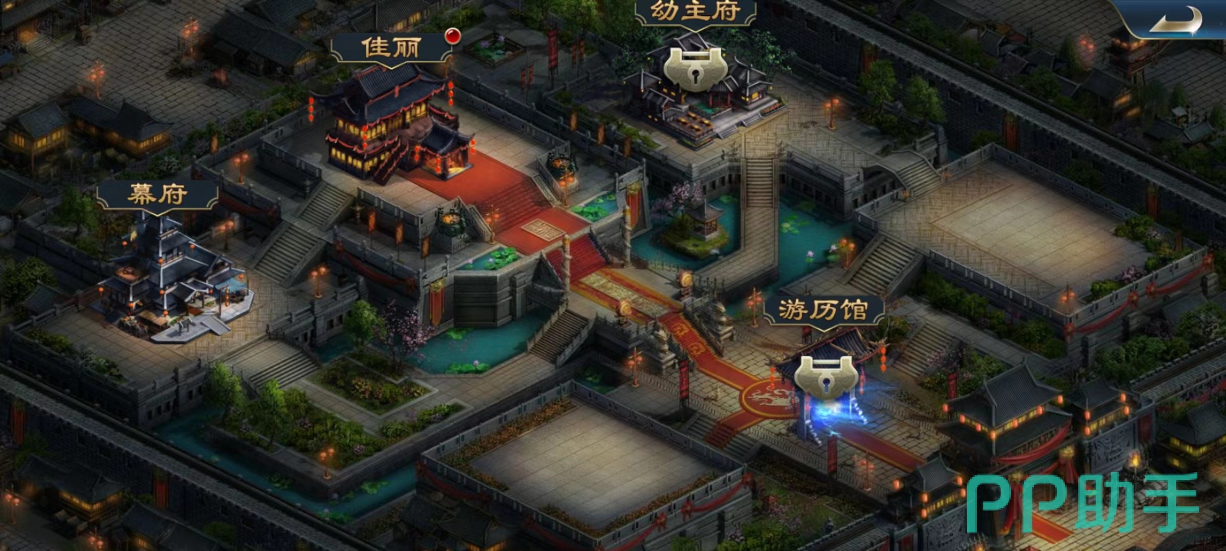 在主界面的下方,等到50级之后就会开放后宫图标,点击进去可以看到整个后宫玩法,分为佳丽、幕府、游历馆和幼主府等多项建筑。和今天介绍相关的只有佳丽,点击进去之后会发现后宫中目前有很多美女等待选择,但是在初期只会开放一个红袖,属于系统赠送类型。后面需要不断搜集各种美女信物进行激活,才可以进行互动。