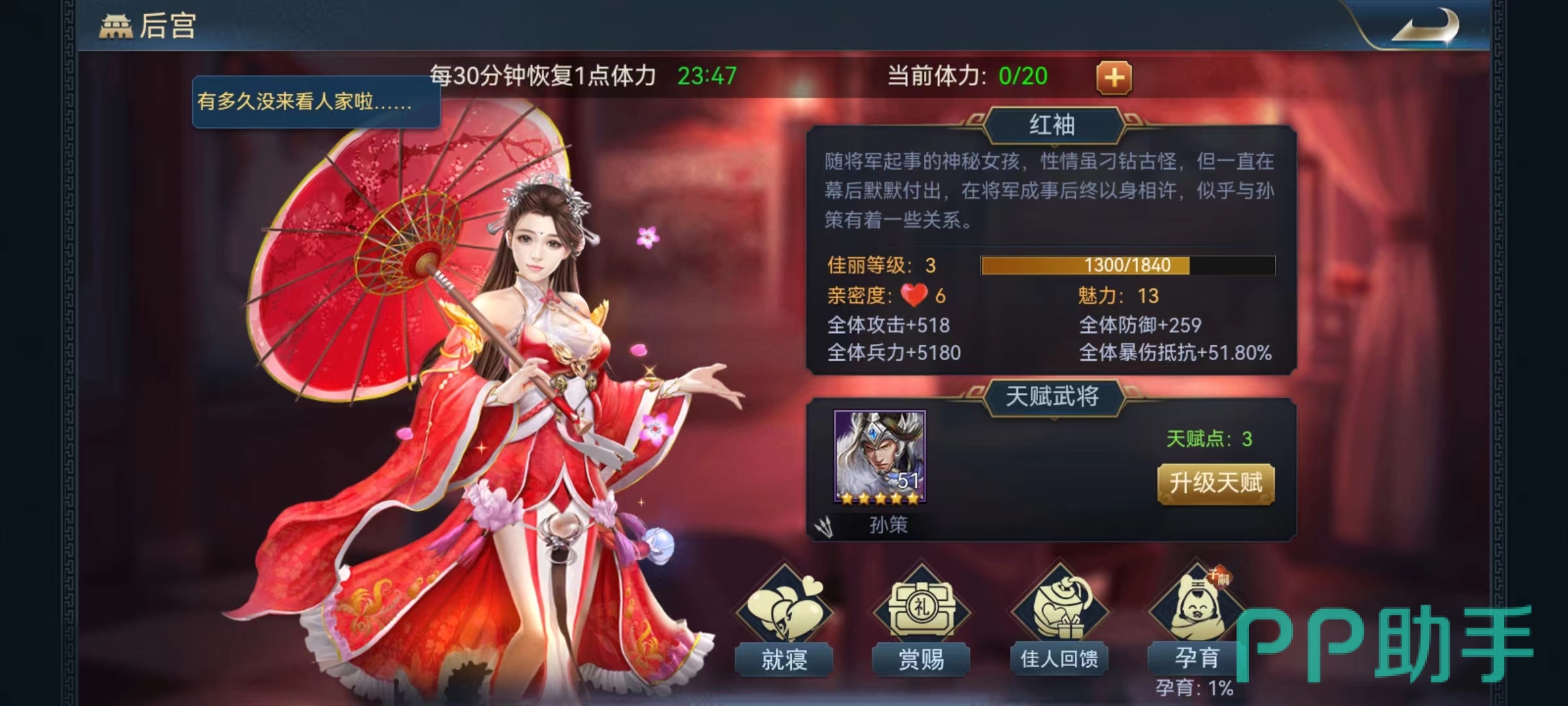 后宫美女们的作用非常大绝不仅仅是好看,每一个美女都对应前庭的一个武将,例如红袖对应的就是孙策,诸葛果对应诸葛亮,周怡对应周瑜。,璃公主对应刘协等。只要能获得这些美女,就可以提高其对应武将的战斗力,而且还可以看到有星级天赋选项,在这里通过提升天赋可以极大强化对应武将的属性,而要想点天赋点就需要提升魅力,这就是说信物玩法其实是和整体战力是相关的。