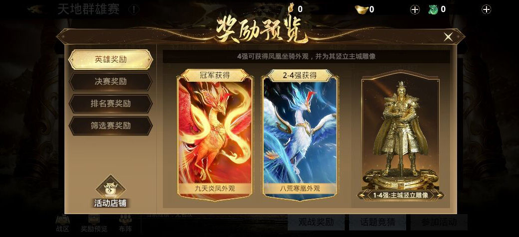 2022年11月23日的更新中,极无双2更新了一个全新的限时玩法,天地群雄赛。按照官方的定性,天地群雄赛就是跨服1v1的pvp战斗,模式里有几个阶段,从前往后依次是筛选赛,排名赛和决赛。