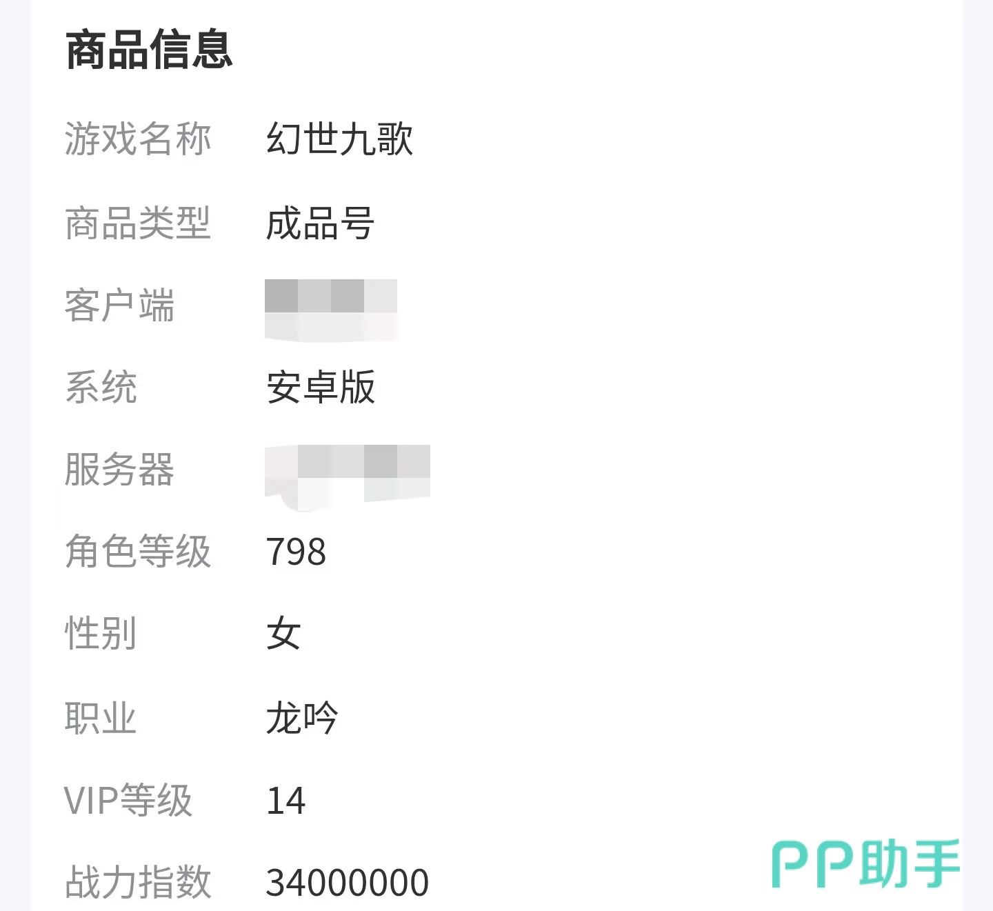 幻世九歌的商品专区也有一个清晰的商品模板商家自行填写,有的买家可能自己的好友就是在九游客户端,所以这些基础的信息都是交易猫强制卖家在发布账号,商品信息的时候必须要填的。剩下的就是关于游戏内的性别、职业、VIP等级和战斗力,争取以最短的时间内让买家对多个账号价值做出对比。