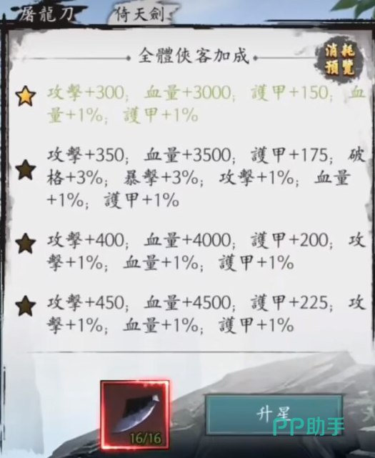 屠龙刀的所有材料,都是用来提升自己的等级,而每个等级的提升,都会牵扯到屠龙刀的各个部分,刀鞘,刀柄,刀锋,刀尖。除此之外,屠龙刀魄也是每个阶段都能用到的东西,屠龙刀升级之后,团队可以得到攻击力、生命值、防御力、暴击率、爆发力等各方面的属性,而且这个数值非常可观,到了后期,一颗星辰就能让团队拥有数十万的战斗力。