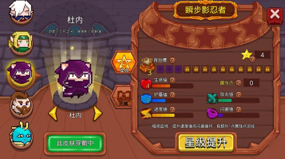 3、杜内:是一名忍者在其外形非常像一只猫,由于全身身穿忍者服,谁也没有见过真实面目。由于职业的原因,在闪避的速度方面比较优秀,属于刺客型的角色。天赋技能能够将自己的武器造成大范围的伤害,从而躲避攻击。技能能够增加手中武器的伤害。此之言一般在后排进行偷袭。