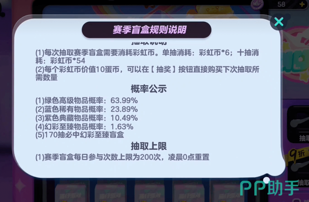 这游戏的抽卡是有保底机制的,最差在170抽的时候一定会出至臻盲盒,大部分玩家肯定是达不到这个上限的,多数都是在100抽左右获得该赛季的高级皮肤,按照彩虹币来看需要700个到800左右,数量还是很大的,建议零氪和微氪玩家存储一段时间的彩虹币,看到自己特别喜欢的皮肤再下池,这样就能一定能中奖。
