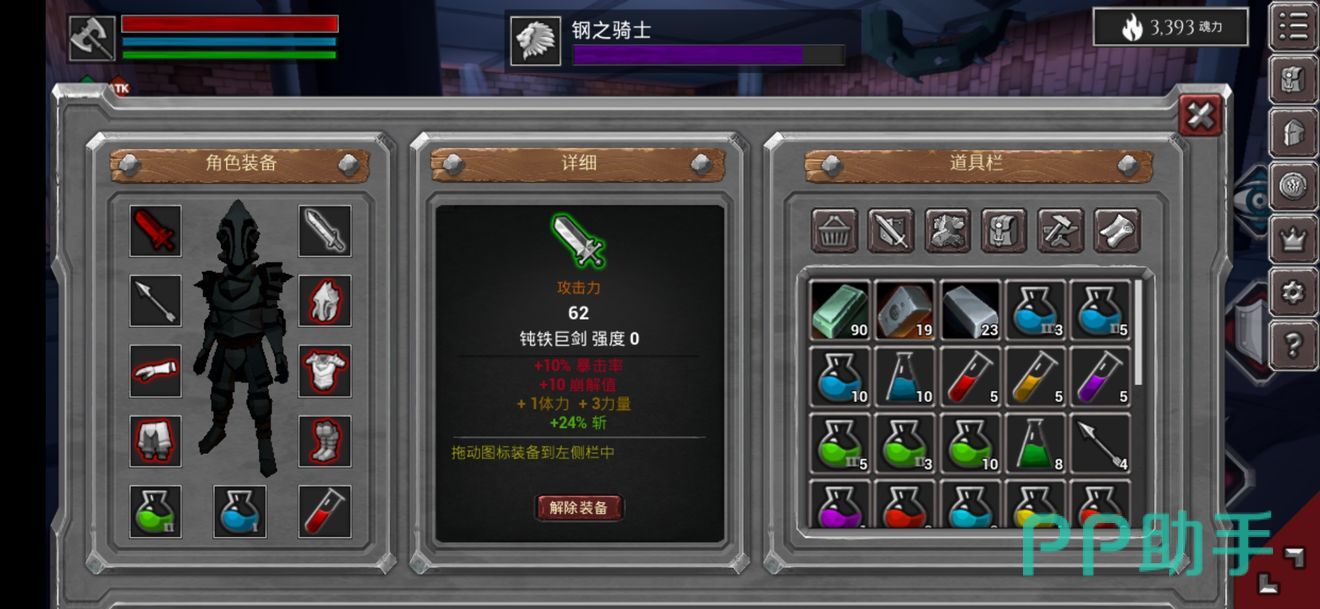 重剑则是典型的一击脱战武器了,攻速慢但势大力沉,要求玩家有更好的攻击节奏和时机,否则攻击落空的话硬直很大,就要被敌人暴揍了。属性好外形帅的黑骑士重斧,需要在后期才能获得,钢之骑士掉落的纯铁巨剑也是好东西。