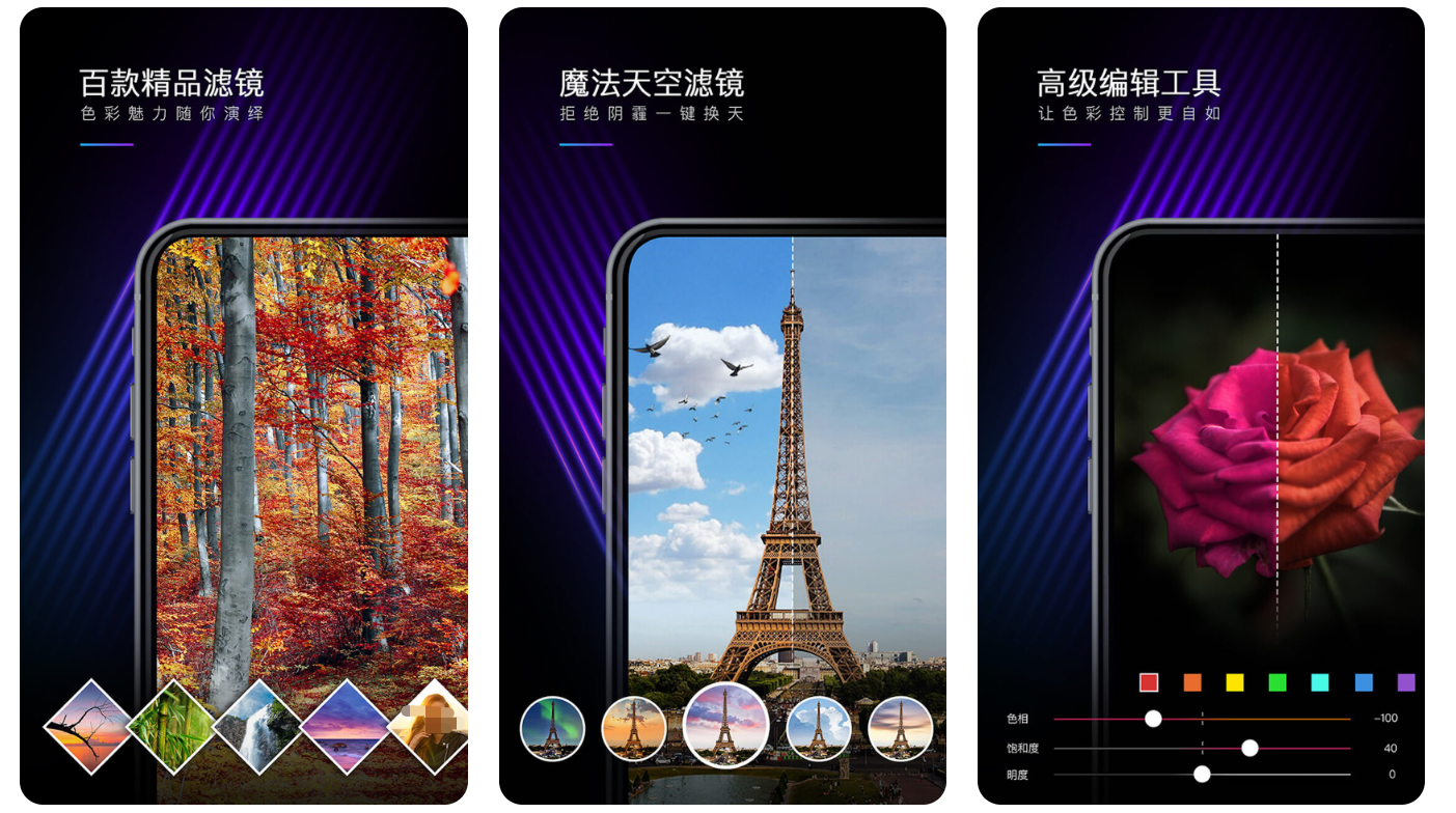 这是一款结合的相机功能与图片编辑功能的综合性软件。小伙伴们在用这款软件进行了拍照后可以挑选自己喜欢的滤镜进行快速的相片调整。也可以进行细致的调整,对颜色、构图、背景、光影等等进行编辑!