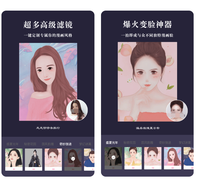 这同样是结合了照相机功能与图片编辑功能的软件,在这里它有着许多热门的滤镜,如网红ins风滤镜、使用场景全覆盖、自然、甜美、复古、卡通漫画滤镜等等,可以瞬间提升小伙伴们的照片质感。