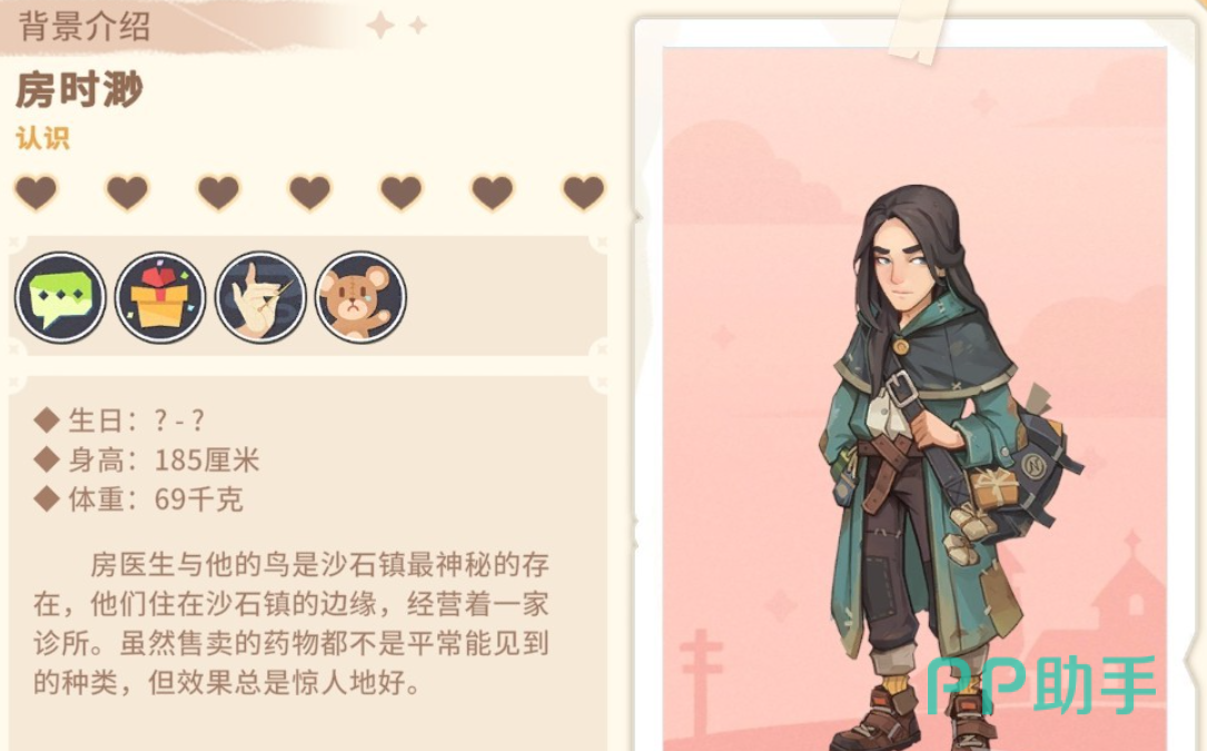 要说在这款游戏中人气最高的角色,那么一定是这位。作为一个对于,在沙漠进行生存经营冒险的种田游戏来说,房时渺与游戏的休闲3d画风有一些不是很符合,感觉像是从金庸世界穿越过来的美男子,而且还有个雕。(大雾)