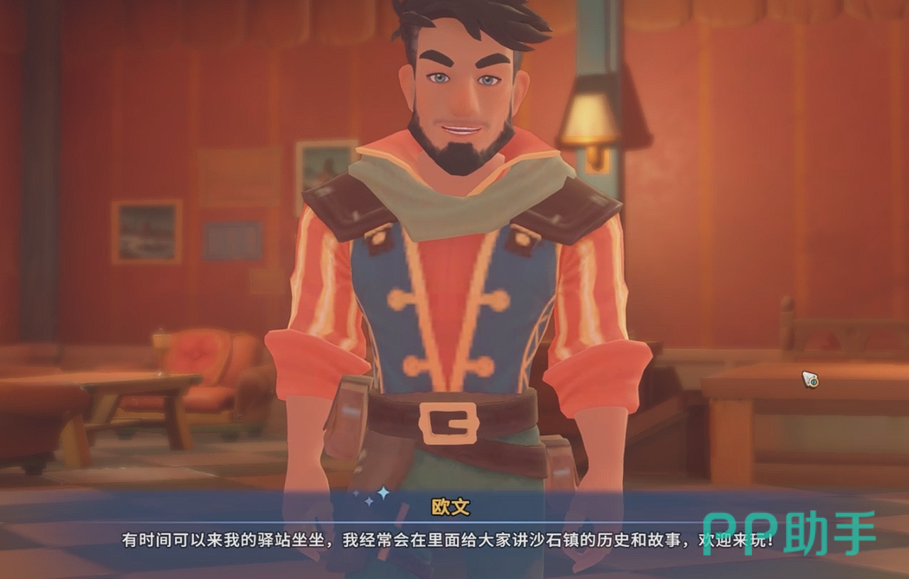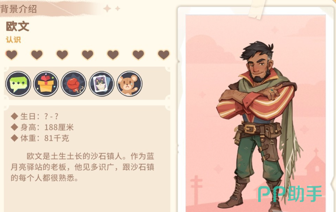 欧文是土生土长的沙石镇人,而且作为月亮驿站的老板,玩家们也是在开始的时候就可以见到他。喜欢与沙漠一切有关的东西,包括沙漠寿司,仙人掌炖肉以及探险家的帽子,衣服等等。通常情况下,他会一直在蓝月亮驿站中的大厅和吧台之间活动。如果我们与他挺好关系的话,就可以在他的店内商品获得最多7.5折的折扣。