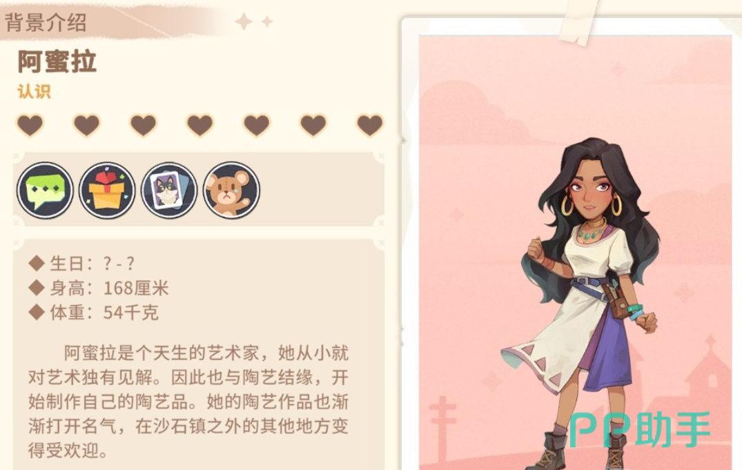 阿蜜拉,是一个天生的艺术家,在沙石镇中,他对艺术有着独特的见解,因此他作为一个陶器店的店长,有着极高的艺术造诣,其陶艺作品在沙石镇以外的地方也有着广泛的人气,很受大家的欢迎。我们可以与她打好关系后,在她的店铺中,商店最多可以打7.5折。