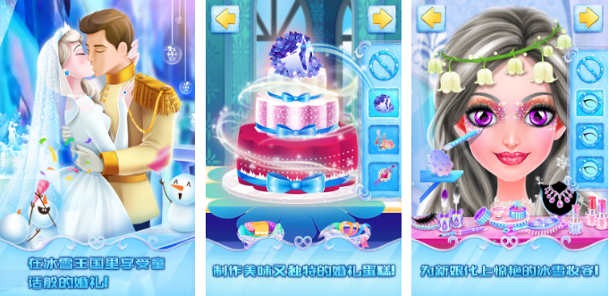 冰雪皇家婚礼是冰雪中的美景,游戏的主角是伊丽莎白公主,他要和自己的王子举办一场婚礼,不止公主的服装和妆容需要玩家进行设计,就连公主的结婚蛋糕也需要玩家开动自己的脑筋,设计一款亮眼的蛋糕,帮助公主更好的完成自己的婚礼。