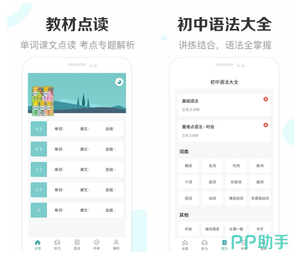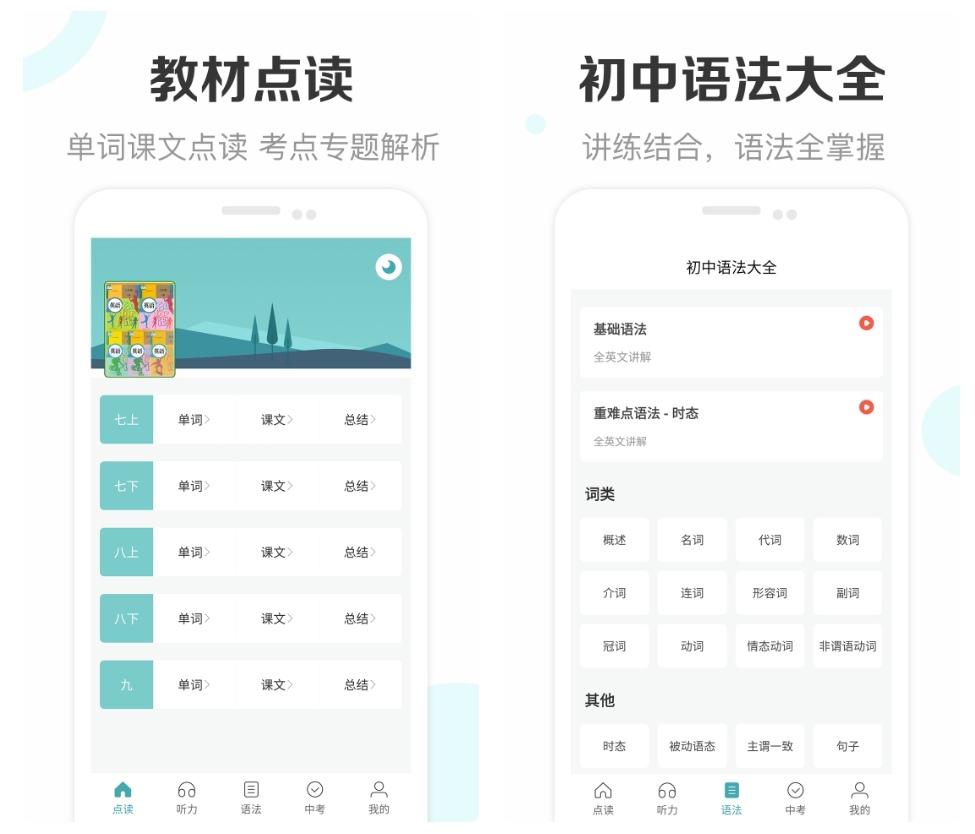初中英语学习配套软件,从七年级到九年级的单词和课文都有,可以跟着视频朗读学习正宗的英语,还可以练习听力由简到难由易到繁的排列方式能够更好地训练孩子们的听力,你可以去自动调节朗读的语速和声音。