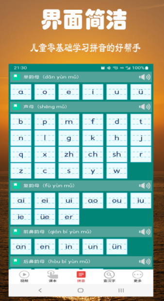 这是一款零基础学习汉语拼音的软件,拥有超全的拼音内容,可以帮助我们快速的进行学习,拥有拼音描红、拼音讲读以及书写教学视频内容等等多方面的帮助,让更多的孩子可以爱上学习。