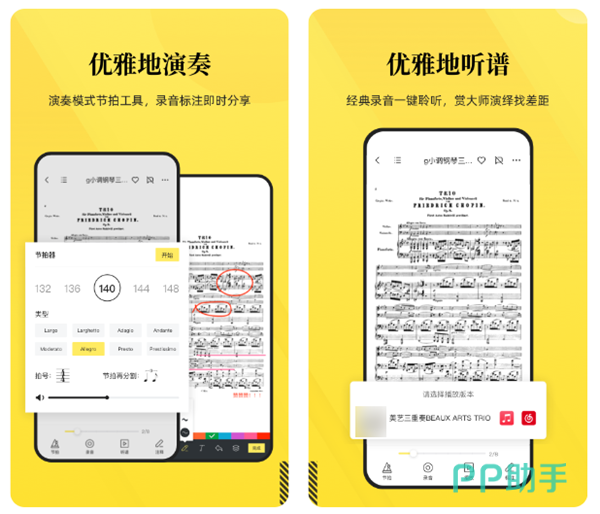这是有款功能非常强大的乐谱软件,你可以通过搜索存储的方式去仿佛的练习你喜欢的乐章。多种设备同步让你使用起来更加的方便,格式统一的模式弹奏起来更加的顺手。