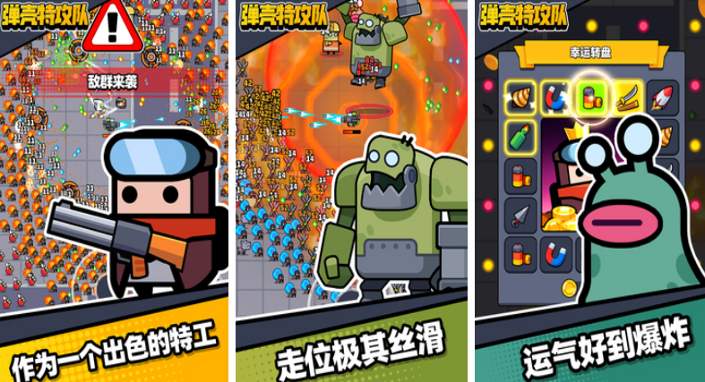 《弹壳特攻队》里的角色和僵尸长相都非常卡通,游戏里的地图像是没有边界,玩家们可以控制一个卡通的角色在游戏的地图上乱走,只要躲避僵尸们的围攻就可以,还有很多技能可以获得,有些技能可以围绕玩家形成一个保护罩,还有踢足球、发射导弹与激光的技能,一局游戏内玩家会遇到三次boss,击败后会回复血量与经验值。