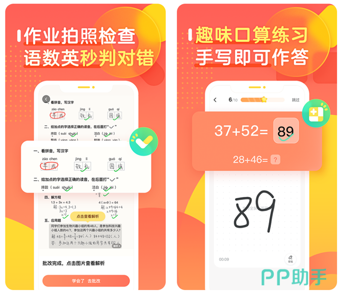 特别好用的一款口算题手机应用软件,玩家可以通过拍照的凡是去帮助同学检查对错,这里覆盖了小学所有阶段的数学语文等相关知识点,通过纠正的方式进行延伸讲解。