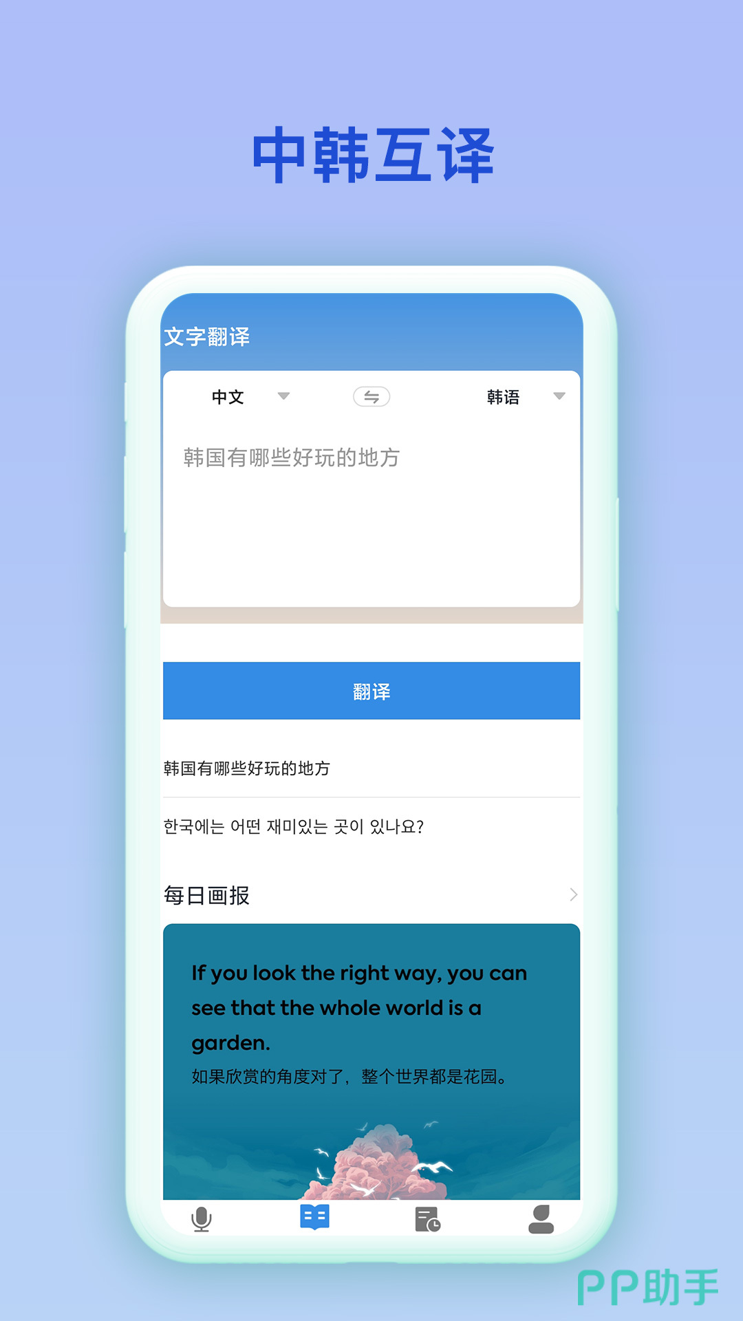 本身是一款韩语和中语相互翻译的软件,但是也能用于学习,翻译的类型非常多,语音、拍照等各种形式都可以输入,可以自己找一些韩文原版的著作利用翻译进行学习,提高非常快。