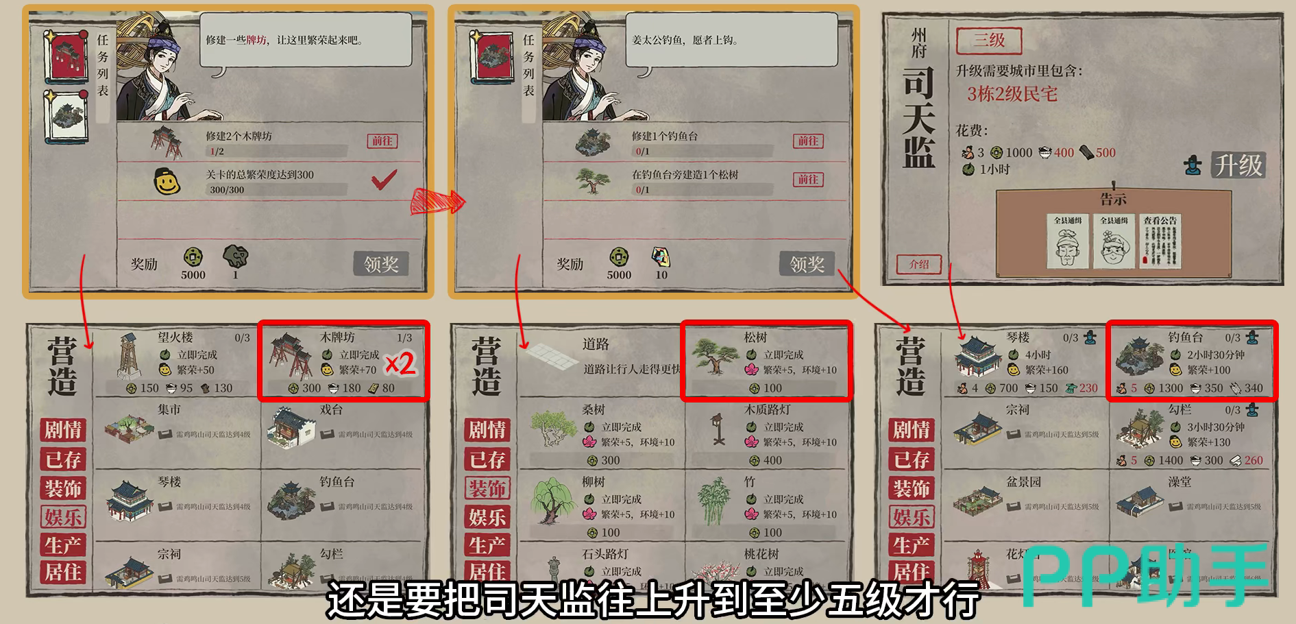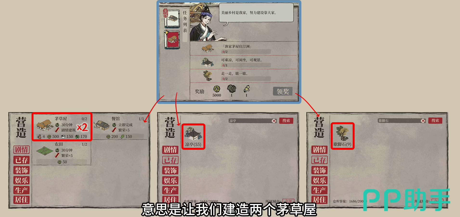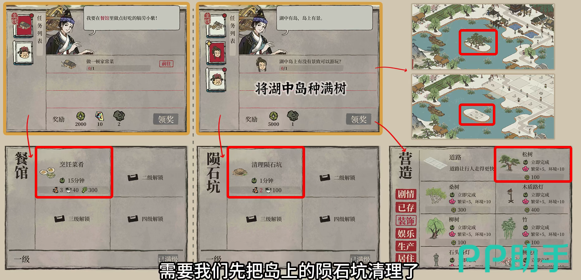 玩家可以根据任务提示在岛上放置鱼塘、渔具店和钓鱼台,这些都是可以直接在营造中进行建造的,不需要使用仓库里的。然后玩家还需要在合适的位置放置两座房屋,一个凉亭和两个歇脚石,这些东西都可以在严大人那里进行交换获取。