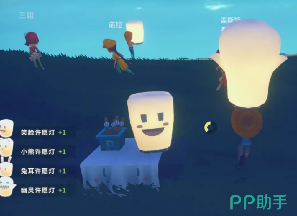 一般大家跟随任务做完以后就可以找到放飞所在地点,到了以后大家就可以直接开始,在河边会有一个桌子,大家过去点击一下就可以获取许愿灯,许愿灯的外形各式各样,但是看起来就会像透明的一样,有笑脸许愿灯、小丑许愿灯、兔耳许愿灯和幽灵许愿灯等等,大家点击许愿灯就可以将灯放上天空。