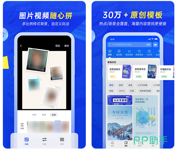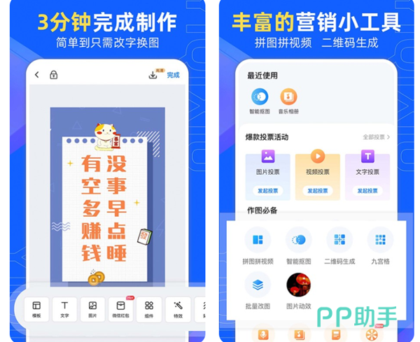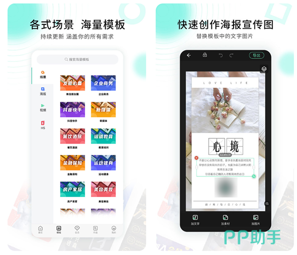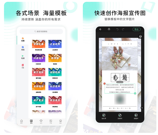 一款专门设计各种海报的手机应用软件,这里有很多的模式你都是可以在线操作的。各种颜色的字体大小都是能够轻松的替换,为你的设计节省了大量的时间,各种材料应有尽有。